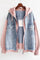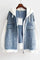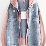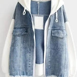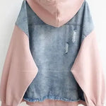 • Материал и конструкция: Елън | Двутонно дънково палто комбинира мека основа от суитшърт с качулка с контрастна предна част от дънки; изработката отразява внимание към всеки шев.